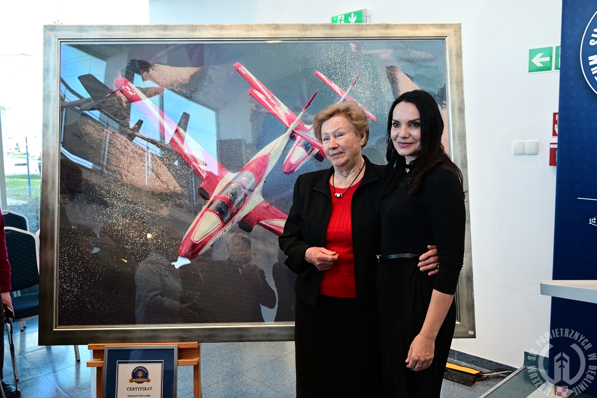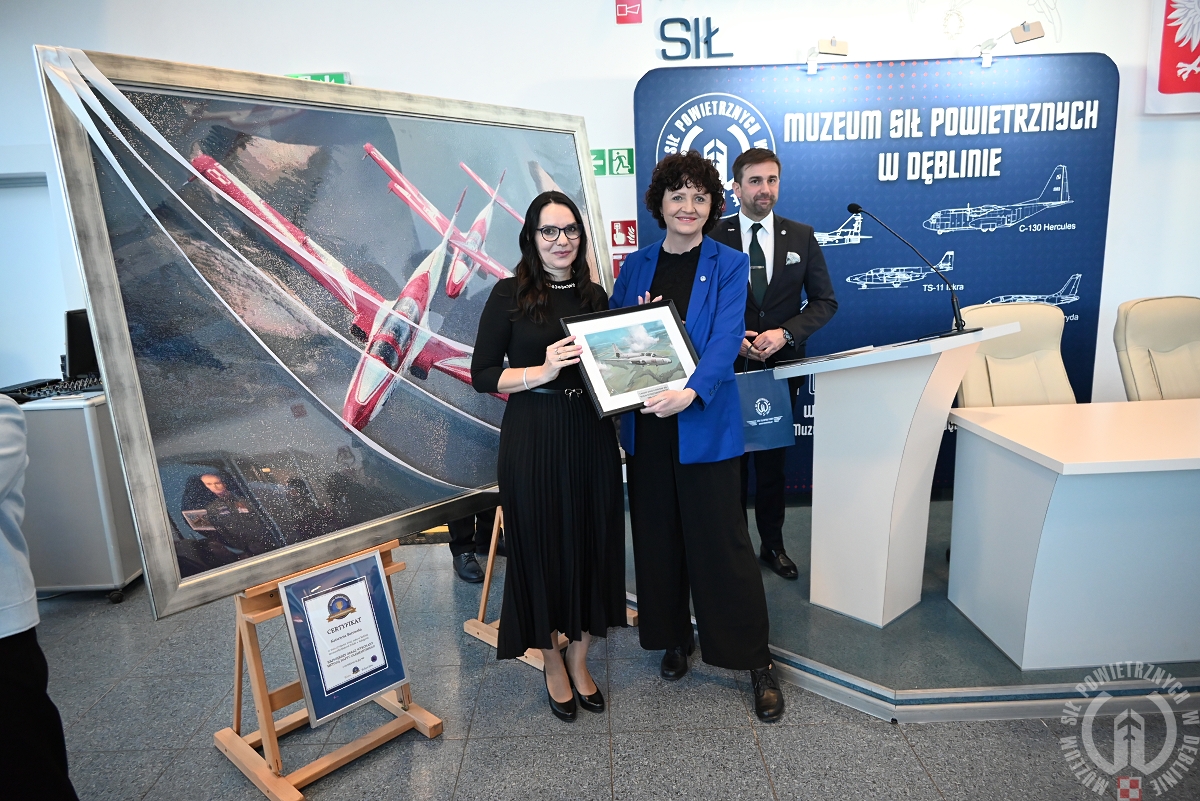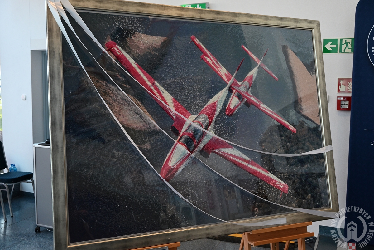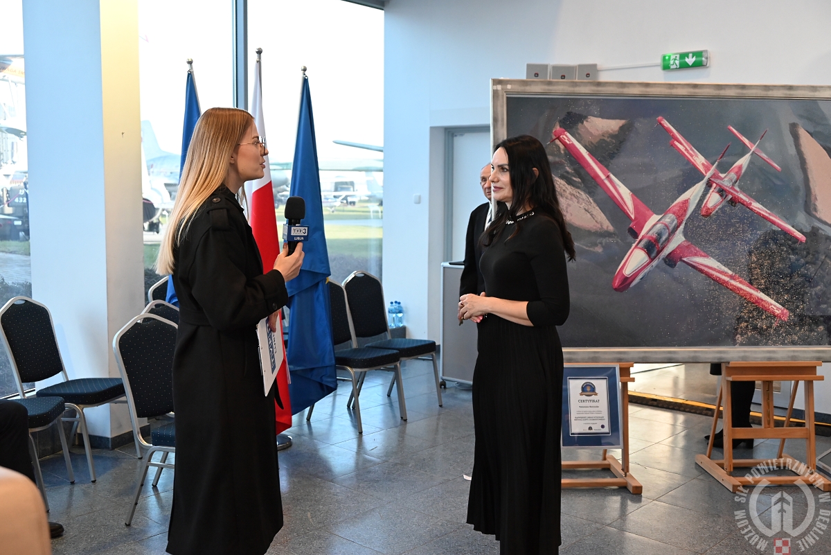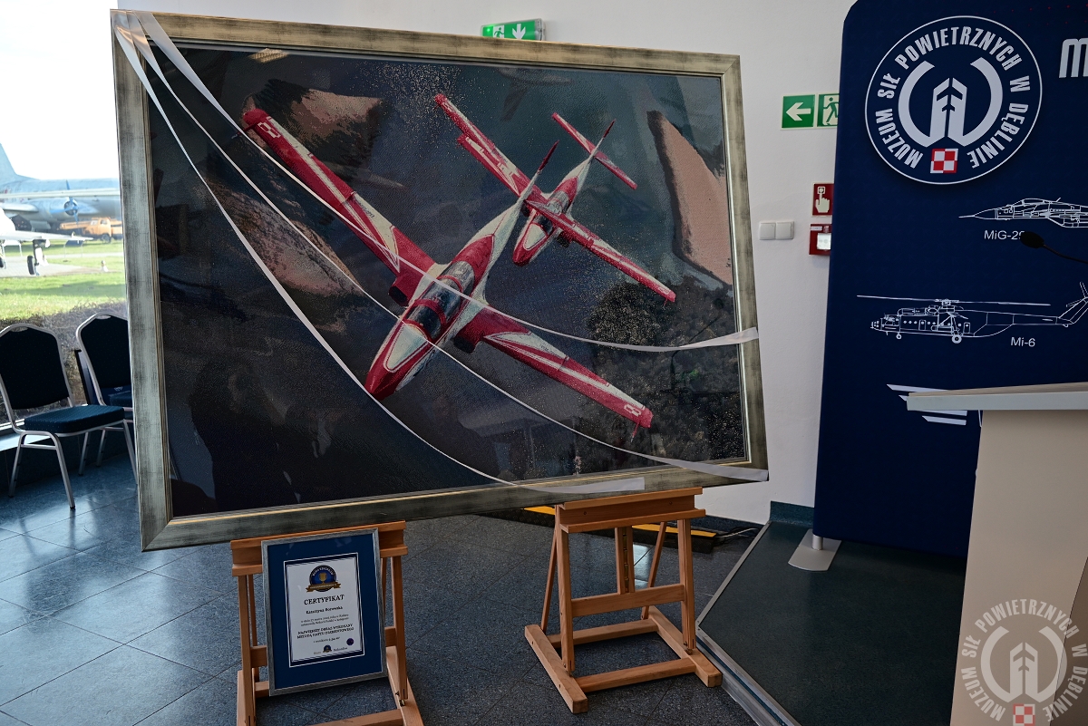 🛩️Oddajmy jeszcze głos wzruszonej autorce dzieła, która podczas ceremonii jego prezentacji dziękowała wielu osobom, które na różne sposoby wspierały ją w żmudnej pracy twórczej – „Bardzo się cieszę, że jesteście tutaj dziś ze mną i że miłość do lotnictwa łączy tak wiele osób. Niech marzenia dodają Wam skrzydeł.” Powiedziała także: „Pracę nad obrazem rozpoczęłam 7 listopada 2023 roku, a ukończyłam ją 20 lutego 2025 roku. Wykonanie obrazu ze zdjęcia w technice haftu diamentowego zajęło mi 618 godzin. (…) Wykonałam obraz o wymiarach 180,2 x 130,1 cm. Składa się on z 375.000 diamencików.”