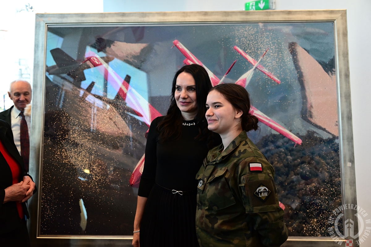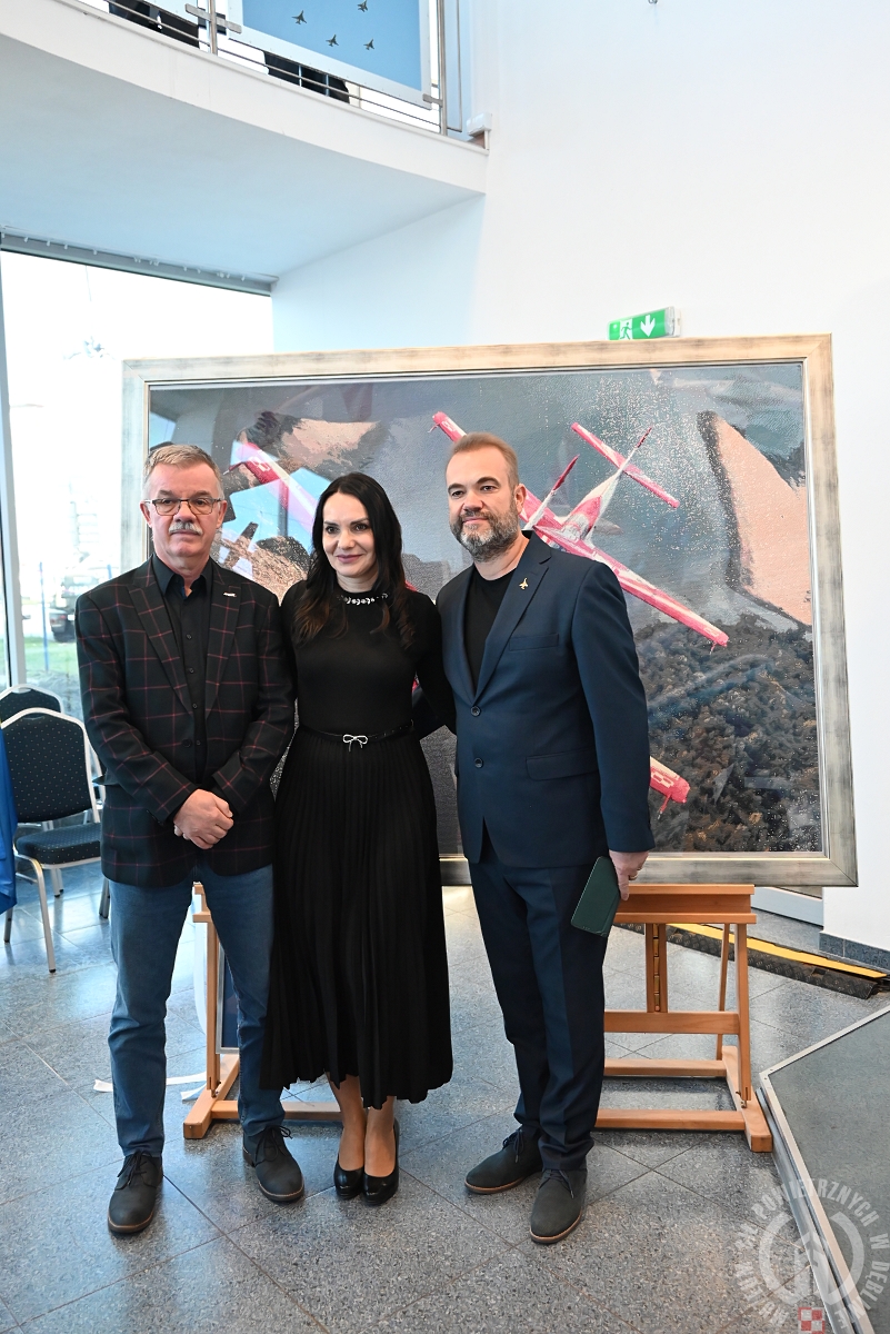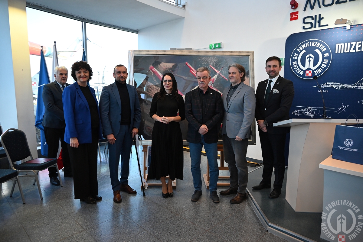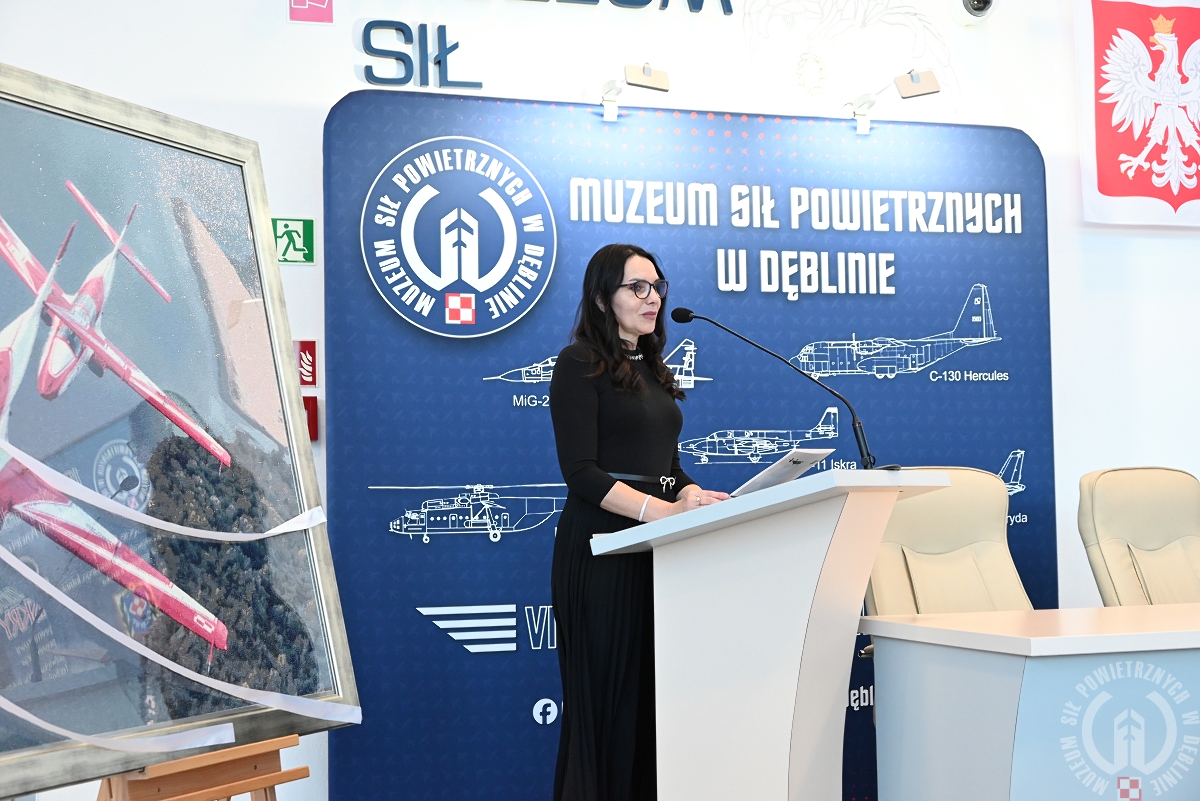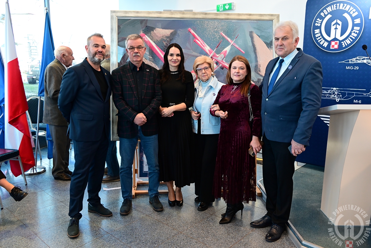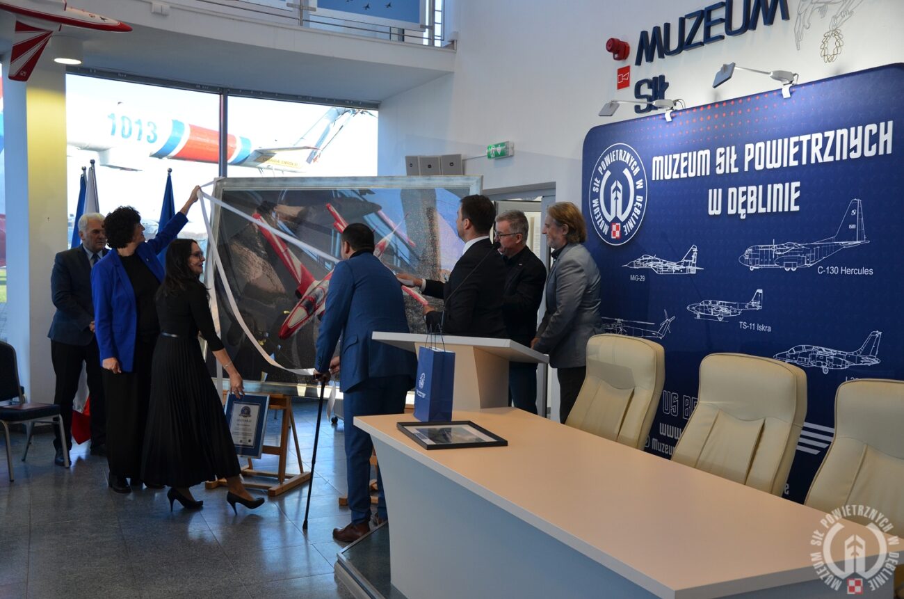 🛩️W uroczystości odsłonięcia tego imponującego dzieła nie mogło zabraknąć pilotów „Biało-czerwonych Iskier”. W ich imieniu głos zabrał płk pil. Dariusz Karwowski, który zwrócił uwagę na piękno kompozycji, wyraził wdzięczność członków zespołu oraz podziw dla pasji, talentu i pracy autorki. Asystowali dodatkowo mjr pil. Paweł Wichowicz, dyrektor Muzeum Monika Żmuda, która gratulowała autorce wielkiej miłości do awiacji oraz sztuki. Zespół odsłaniających obraz zamykali Jakub Mitek, zastępca dyrektora Muzeum, który wymyślił nazwę tego dzieła i prowadził projekt od początku, a także last but not least – płk. pil. Tomasz Czerwiński, jeden z dowódców „Biało-czerwonych Iskier”. To on, charakterystyczną, znaną z dowodzenia formacją podczas pokazów komendą „RAZ”, dał sygnał do synchronicznego zerwania wstęgi i symbolicznego odsłonięcia „Diamentowych Iskier”.