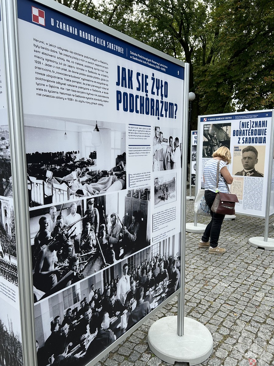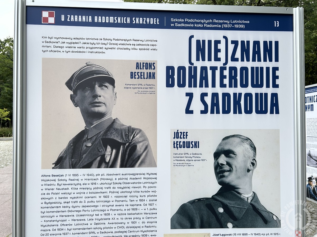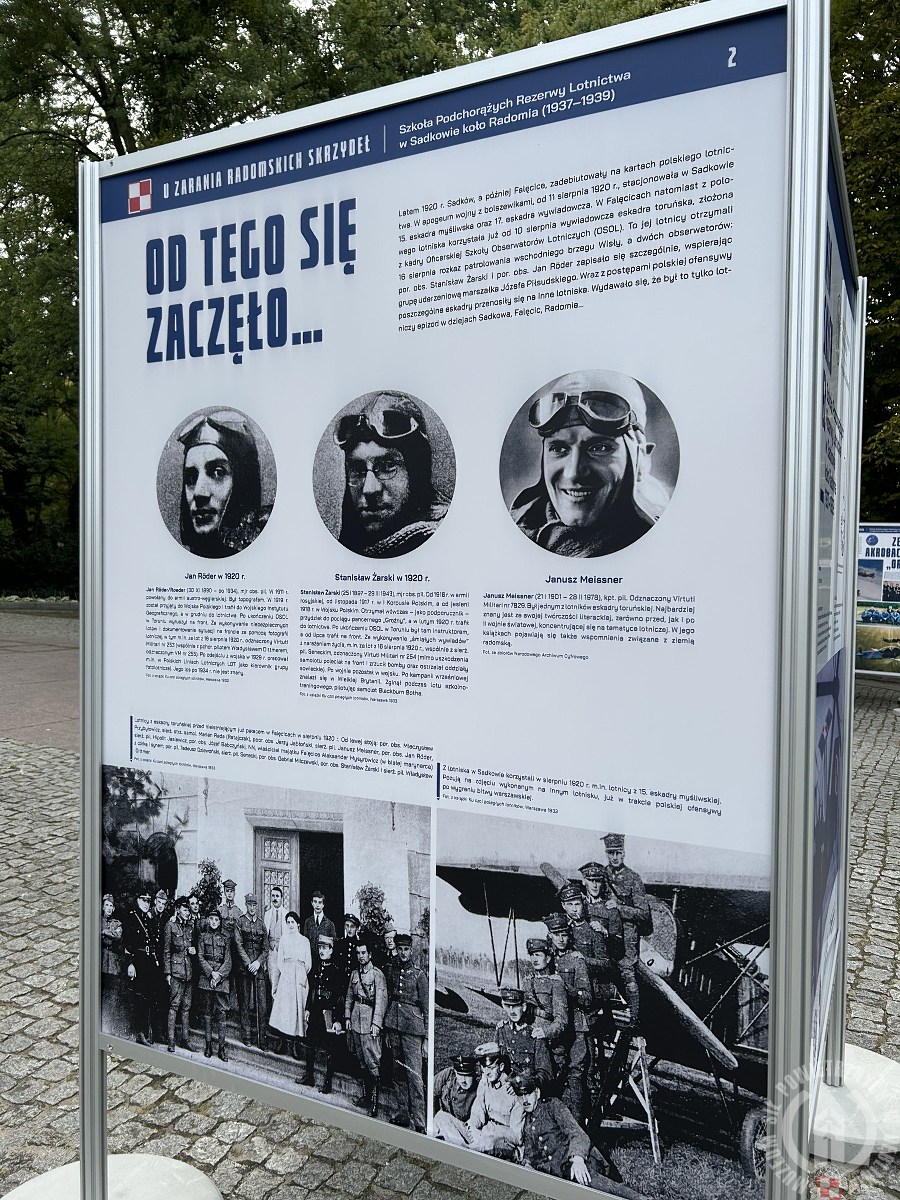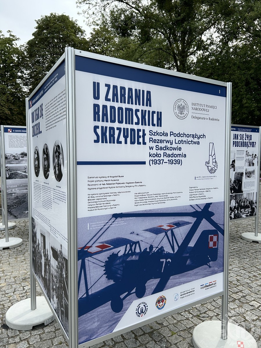 Wystawę plenerową „U zarania radomskich skrzydeł. Szkoła Podchorążych Rezerwy Lotnictwa w Sadkowie koło Radomia (1937–1939)” można oglądać jeszcze przez dwa tygodnie w Radomiu przed pomnikiem Jana Kochanowskiego na ulicy Żeromskiego. Ekspozycja plenerowa jest rozwinięciem książki dr. Krzysztofa Busse, wydanej przez Instytut Pamięci Narodowej. Wystawa poświęcona jest mającym już 125 lat lotniczym tradycjom Ziemi Radomskiej. Dlaczego 125 lat?… To historia związana z Czesławem Tańskim i jego „lotnią”. Obok delegatury IPN, organizatorami wystawy są Muzeum Sił Powietrznych w Dęblinie, Urząd Miejski w Radomiu, 42. Baza Lotnictwa Szkolnego, a także OKiSz „Resursa Obywatelska”. Scenariusz wystawy przygotował dr Krzysztof Busse, a projekt graficzny Marcin Kucewicz. Jakub Mitek, zastępca dyrektora Muzeum, uczestniczył zarówno w procesie jej tworzenia, jak też w ceremonii otwarcia.