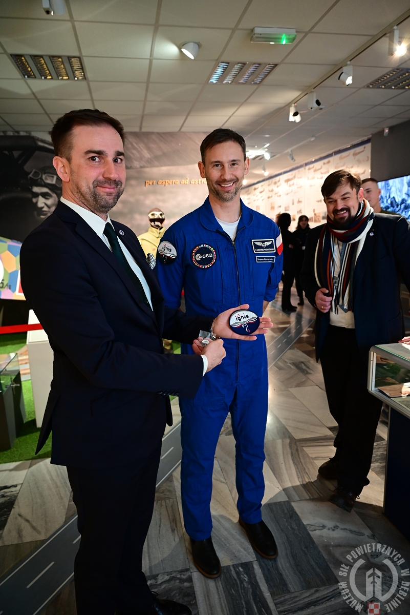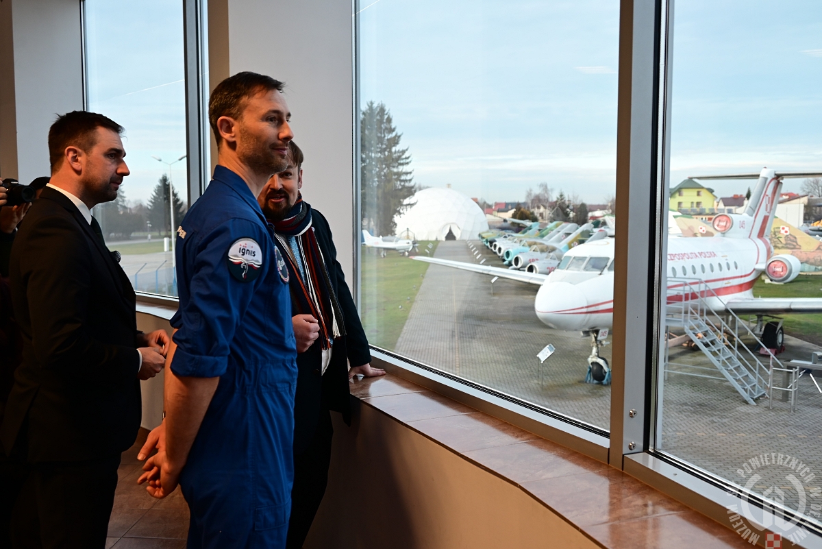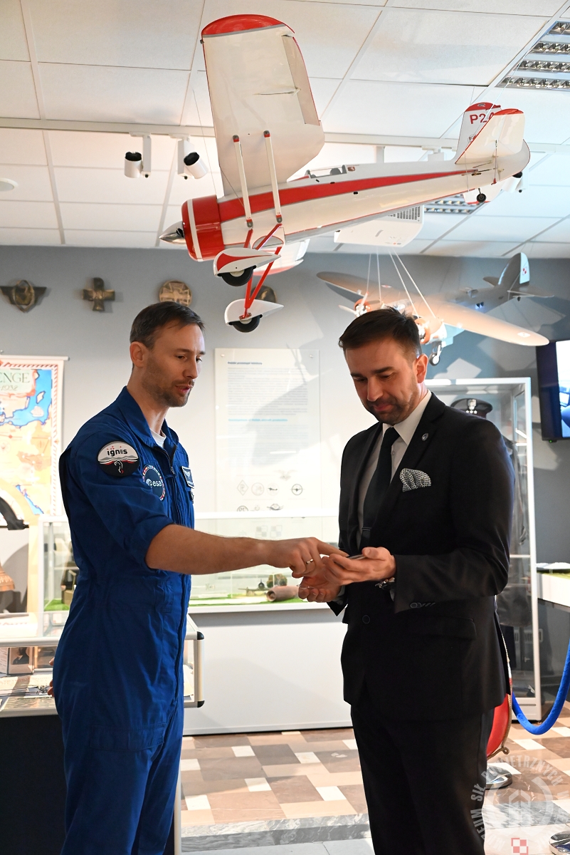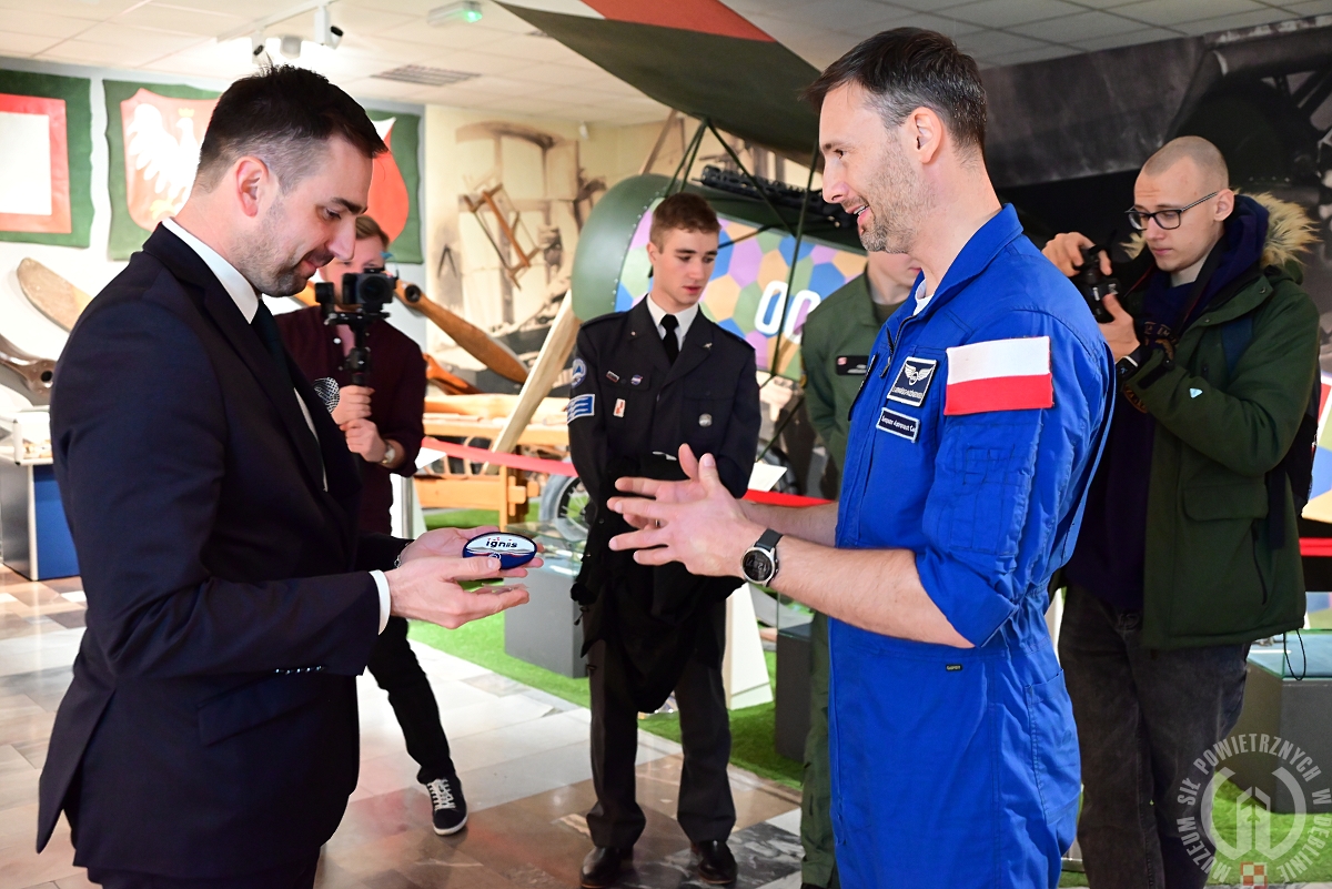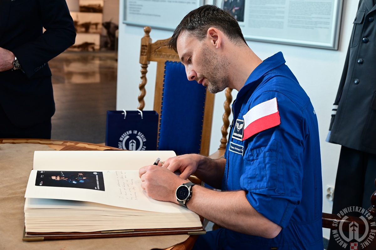 Podczas pobytu w Muzeum Sławosz Uznański-Wiśniewski przekazał na ręce Zastępcy Dyrektora Muzeum, Jakuba Mitka, pamiątkową naszywkę oraz przypinkę misji IGNIS – gest o ogromnym znaczeniu symbolicznym, który na trwałe wpisuje tę wizytę w historię naszej instytucji. Astronauta dokonał również wpisu do Księgi Pamiątkowej Muzeum, pozostawiając osobisty ślad swojej obecności w miejscu opowiadającym o polskich marzeniach o lataniu.